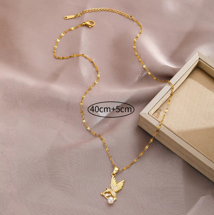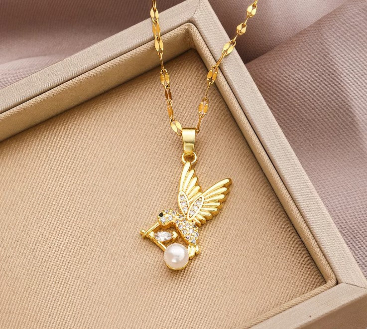 Collar "Colibrí con Perla" en Acero Inoxidable y Cristales
