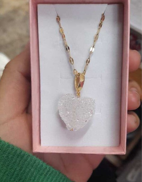 Un diseño que irradia amor y luz. Este collar es una declaración de estilo romántico y sofisticado. El corazón transparente, que parece capturar mil destellos, brilla de manera única gracias a su superficie texturizada. La cadena, de estilo moderno y tono dorado, se siente suave y cómoda alrededor del cuello.